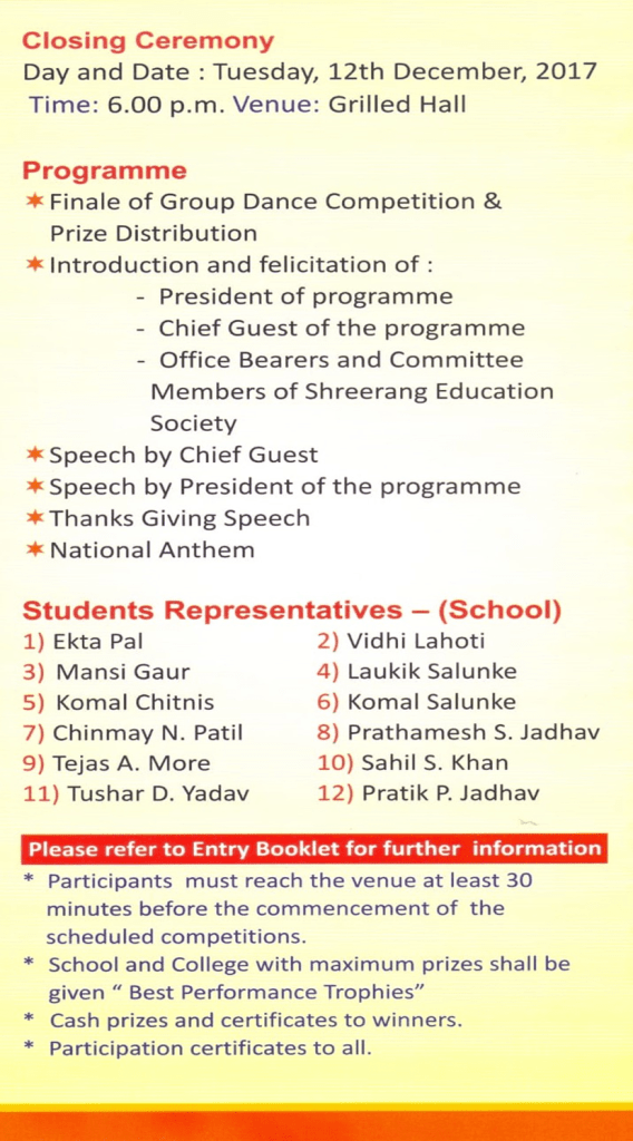 Shreerang Education Society’s Shreerang Vidyalaya and Junior College of Science and Commerce organized SAARANG – 2017, Junior College Festival and Silver Jubilee year of Secondary Section on Monday, 11thDecember,2017 and Tuesday,12th December, 2017