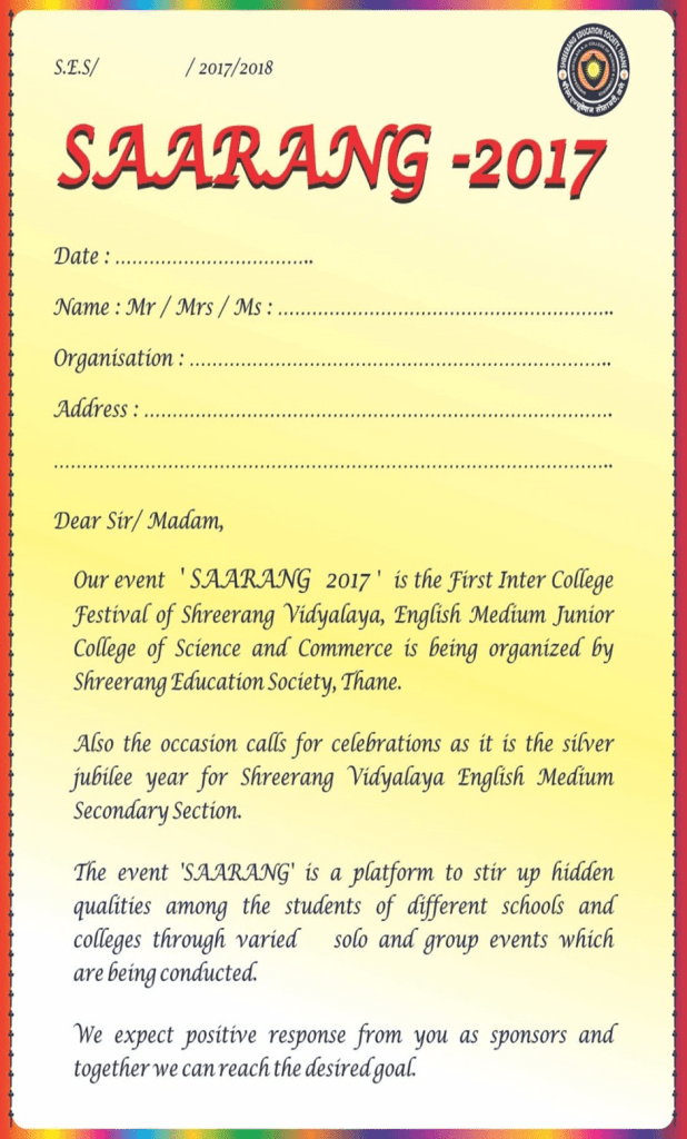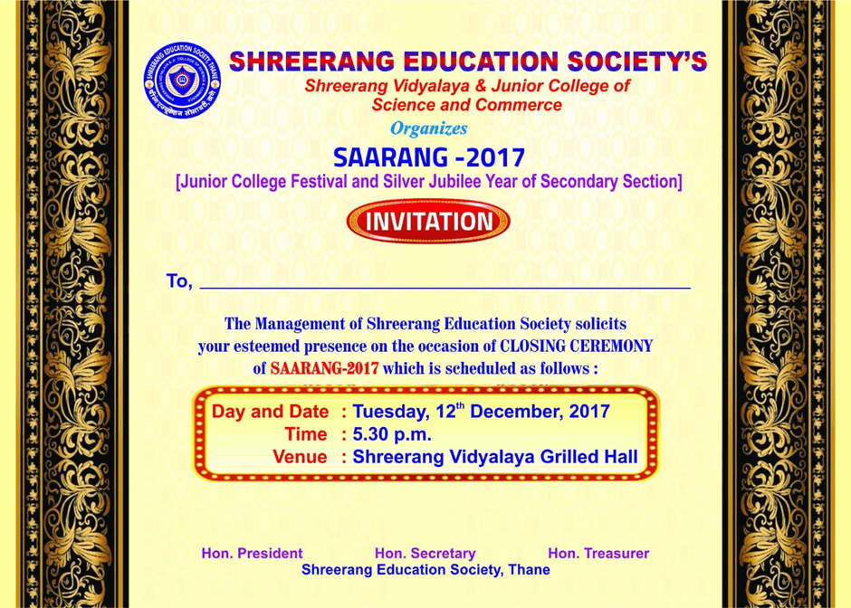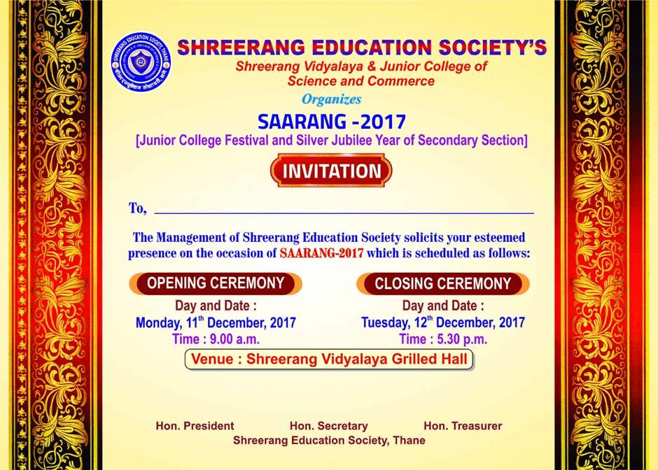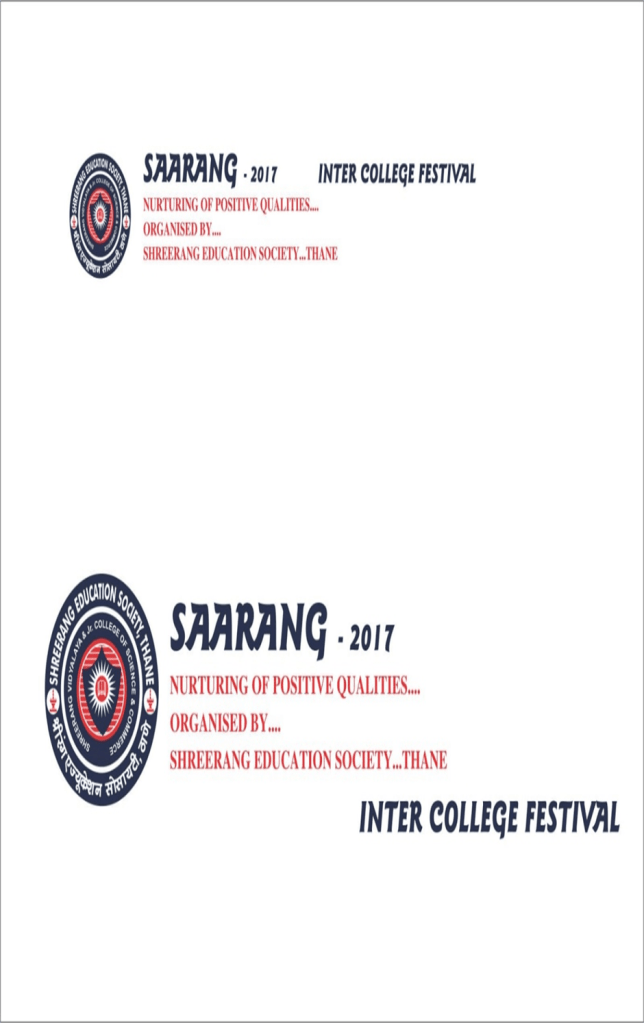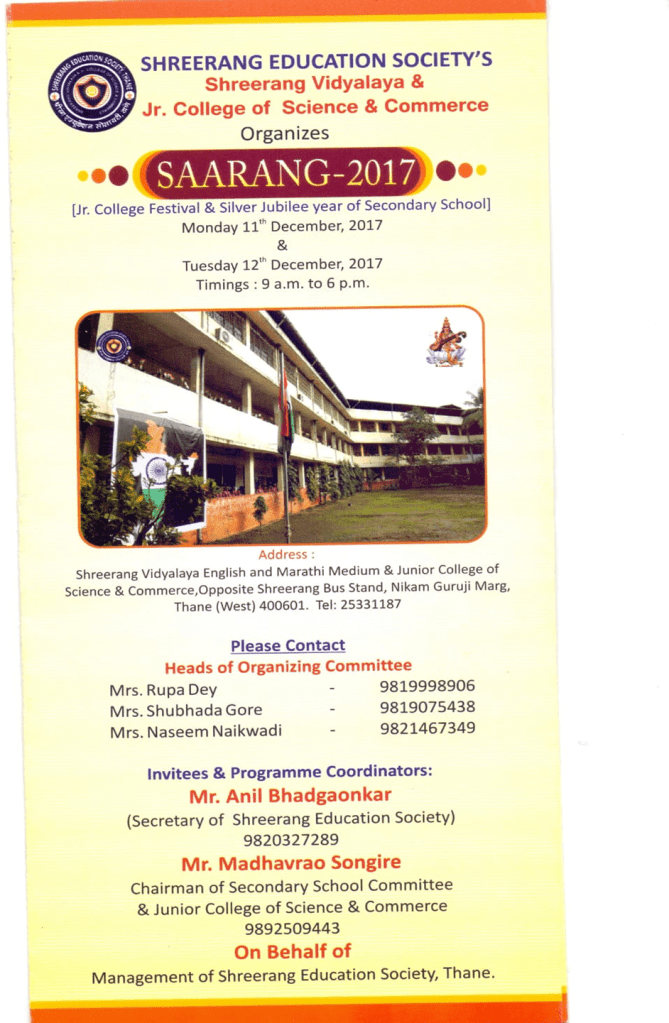 Shreerang Education Society is organizing SAARANG 2017, an inter college Festival and Silver Jubilee Year of Shreerang Vidyalaya English Medium Secondary Section. It is a festival where there will be contribution of all Schools under the Trust. In this mega event there are 62 schools and colleges who are participating. The number of participants is 2800. The Event is being organized to provide a platform to budding talents all over Mumbai and Thane. Nearly 21 events / competitions have been organized for groups of V to VII, VIII to X, and Junior College.