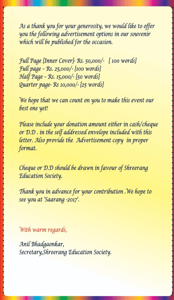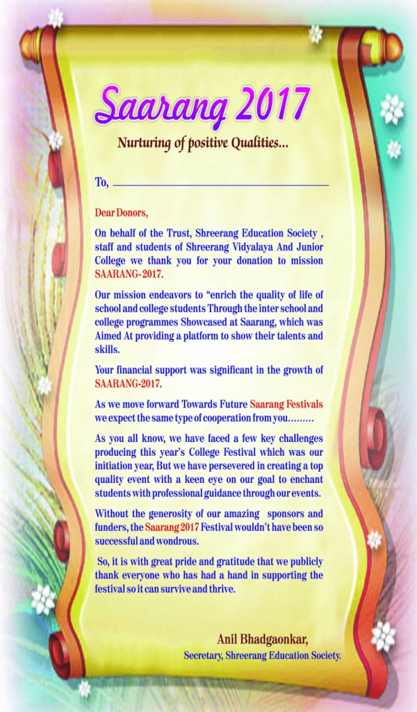 Today we take immense pleasure in handing over to youthe souvenir ‘SAARANG 2017’ which is published on the occasion of first Inter College Festival and Silver Jubilee Year of Shreerang Vidyalaya English Medium Secondary Section.