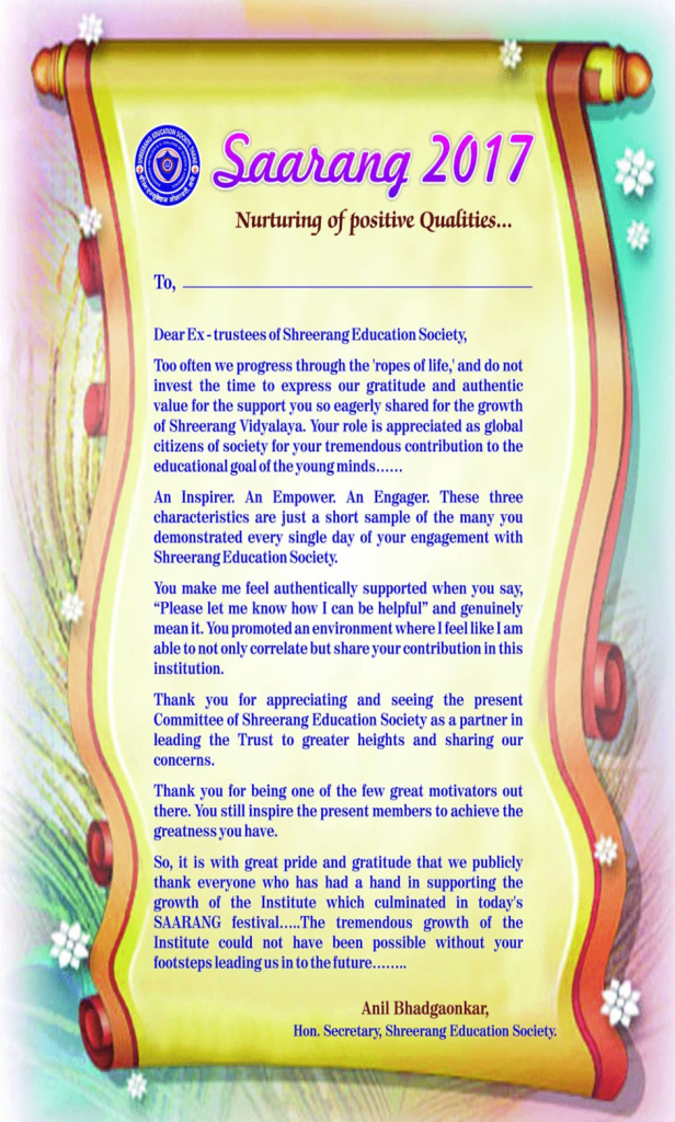Season’s Greetings to everybody. As the President of Shreerang Education Society, I convey my best wishes to each and everyone associated with Shreerang Education Society from its very inception, on the occasion of the silver jubilee year of Secondary Section of Shreerang Vidyalaya (English Medium) which coincides with “SAARANG 2017” – the first Cultural Festival of our Junior College of Science and Commerce. Cultural Festival in simple words, can be described as an identity where various attributes of human values, such as attitudes, preferences, knowledge, etc., are tested in a particular social group, which could have positive influence on social development of any student in the formative stages of his/ her life. It is therefore very much necessary to have such forum of expression. This identity also plays very important role in making students self-motivated in the social activities/ developmental activities. The recognition of students as an individual or a group is the main key to such motivation. This eventually gives positive impact on the making of better creative environment in a school or college that in turn leads to creation of knowledge society. I recognize that it takes huge efforts to organise inter-school and/ or inter-college level programmes such as “SAARANG” and therefore I wish to take this opportunity to salute the zeal and enthusiasm of the Staff and Students of all sections of Shreerang Vidyalaya. Knowledge Society is a version of evolution of continued development within various strata of Society, the basis of which is shaping young minds. I am proud to see how wonderful it is that we have teachers of exceptionally high calibre whose wisdom is available to the student community of Shreerang Vidyalaya. Shreerang Vidyalaya set up Junior College in Commerce and Science Faculties with explicit goal of providing holistic education to the students and preparing them to face all types of challenges in life. There can be no better opportunity than “Saarang 2017” to showcase and nurture hidden talents of our students. I wish to acknowledge with gratitude to the efforts taken by my fellow colleagues from Shreerang Education Society (SES) in organizing an event of such magnitude. I have truly enjoyed being a part of the Management of SES and feel proud to have been able to apply the latest technology to the wonderful legacy of Shreerang Education Society and to bring it to its fruitful growth. It warms my heart to know that what we have done over the past few years has brought accolades and recognition to the parent body and to the school. For me personally, it was really a challenge to step out of the normal and experiment with the developmental projects of Shreerang Vidyalaya in case of both – infrastructure and human development. It will always be one of the most memorable milestones of my association with Shreerang Vidyalaya as a past student, past committee member and as a two-term President of Shreerang Education Society. My hearty congratulations to the Principal of English Medium Secondary Section of Shreerang Vidyalaya Ms. RUPA DEY for her valued leadership, Teachers and non-teaching Staff, from the bottom of my heart for the Silver Jubilee Celebrations of the School and for initiating Saarang. Such events are useful to push our limits and test our potential to organise such events. Competing with other students helps students to judge themselves more effectively. The work pressure also adds to the demands on the students, especially those involved in organising such festivals. I also take this opportunity to express my sincere thanks to all student representatives, Heads of schools, Sponsors, Donors and parents for their wholehearted support and rewarding association with the school and Management. I wish Saarang, a grand success.