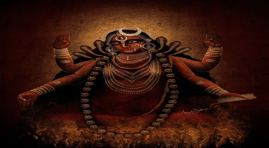 Ma Kali is the conclusive system of Brahman, “Devourer of Time” and the supreme deity of the Kalikula System. Mahakali is of a jet-black appearance. Her three eyes represent the past, present and future. She has vivid snowy, fang-like teeth, a wide mouth, and her red, blood-stained tongue showing from there. She has released, messy hairs. She is seen wearing a garland made of skulls and a garland of red hibiscus flowers around her neck. Her ornaments are skeletal bones, skeletal hands as well as disengaged arms and hands as a girdle around her waist. She adorns four hands, two of which are empty and the other two carry a machete and a demon head. Commonly known as Maha Kali she is the Hindu Divinity of annihilation and end of the world. She is defined as one of the fiercest of the Deities of widespread supremacy, time, life, death, including rebirth and liberation.